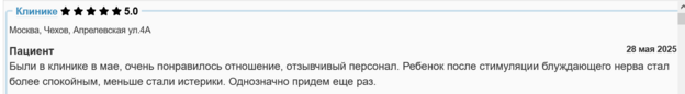 Были в клинике в мае, очень понравилось отношение, отзывчивый персонал. Ребенок после стимуляции блуждающего нерва стал более спокойным, меньше стали истерики. Однозначно придем еще раз.
