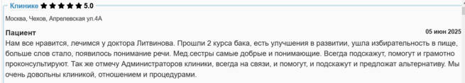 Нам все нравится, лечимся у доктора Литвинова. Прошли 2 курса бака, есть улучшения в развитии, ушла избирательность в пище, больше слов стало, появилось понимание речи. Мед. сестры самые добрые и понимающие. Всегда подскажут, помогут и грамотно проконсультируют. Так же отмечу Администраторов клиники, всегда на связи, и помогут, и подскажут и предложат альтернативу. Мы очень довольны клиникой, отношением и процедурами.