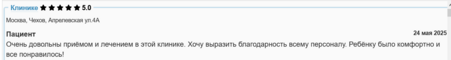 Очень довольны приёмом и лечением в этой клинике. Хочу выразить благодарность всему персоналу. Ребёнку было комфортно и все понравилось!