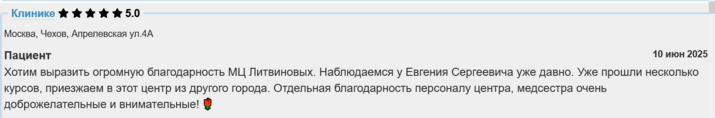 Хотим выразить огромную благодарность МЦ Литвиновых. Наблюдаемся у Евгения Сергеевича уже давно. Уже прошли несколько курсов, приезжаем в этот центр из другого города. Отдельная благодарность персоналу центра, медсестра очень доброжелательные и внимательные! 🌹